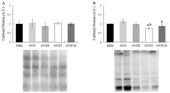 The analysis of carbonyl protein levels, a marker of oxidative stress, failed to indicate any significant group difference in soleus muscle (Figure 6A). However, the analysis showed significant group differences in the gastrocnemius muscle (Figure 6B): (1) the OVXV group had a lower value of carbonyl protein than the SHM group (p = 0.046), and (2) the OVXV (p = 0.002) and OVXVE groups (p = 0.034) indicated a lower carbonyl protein value than the OVX group.