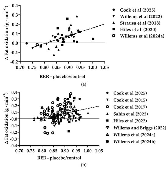 Relationship between the exercise-induced respiratory exchange ratio (RER) in the placebo/control and changes (∆) in exercise-induced fat oxidation with the intake of New Zealand blackcurrant extracts for females (a) and males (b). The dotted lines indicate the linear positive correlations. Datapoints for females (a): ●, from Cook et al. [22]; ▼, Willems et al. [26]; ▲, Strauss et al. [24]; ■, Hiles et al. [25]; ◯, Willems et al. [28]. Datapoints males (b): ●, Cook et al. [22]; ▼, Cook et al. [20]; ◯, Cook et al. [21]; ▲, Şahin et al. [23]; ■, Hiles et al. [25]; ▽, Willems and Briggs [27]; △, Willems et al. [28]; ✺, Willems et al. [29].