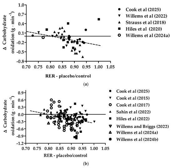 Relationship between the exercise-induced respiratory exchange ratio (RER) in the placebo/control and changes (∆) in exercise-induced carbohydrate oxidation with the intake of New Zealand blackcurrant extracts for females (a) and males (b). The dotted lines indicate linear negative correlations. Datapoints for females (a): ●, from Cook et al. [22]; ▼, Willems et al. [26]; ▲, Strauss et al. [24]; ■, Hiles et al. [25]; ◯, Willems et al. [28]. Datapoints males (b): ●, Cook et al. [22]; ▼, Cook et al. [20]; ◯, Cook et al. [21]; ▲, Şahin et al. [23]; ■, Hiles et al. [25]; ▽, Willems and Briggs [27]; △, Willems et al. [28]; ✺, Willems et al. [29].