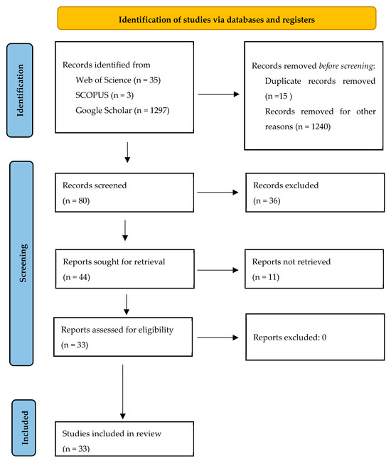 Articles containing virtual avatars and other virtual environments were discharged. Exclusion criteria were also based on the degree of immersion; studies that used only products exposed to online shopping websites and did not have a three-dimensional-based supermarket were not included. Articles only describing environment applications without implementation and without results presented were also discharged. This search resulted in 1335 articles, from which a total of 1302 were excluded and 33 were included in this study.