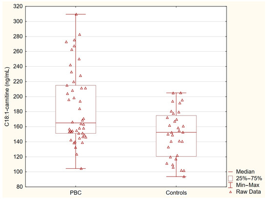Table 2 presents the concentrations of acylcarnitines and free fatty acids in the healthy controls and patients with primary biliary cholangitis (PBC). The levels of C14-carnitine, C16-carnitine, and C18-carnitine were similar between the two groups. In contrast, the concentration of C18:1-carnitine was significantly higher in the PBC group (p = 0.0036), and the free fatty acid levels were markedly elevated in the PBC patients (p < 0.0001). These statistically significant differences indicate specific alterations in lipid metabolism associated with PBC (Table 2, Figure 1 and Figure 2).