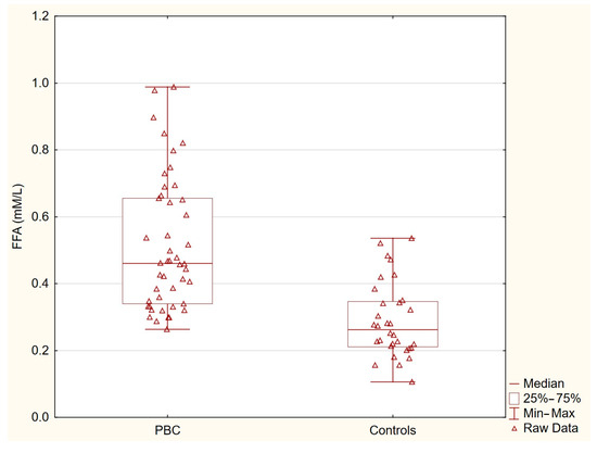 Free fatty acids in PBC group and control group. Free fatty acid levels were markedly elevated in patients with PBC compared with the healthy controls (p < 0.0001).