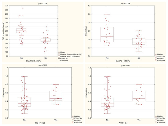 Correlation analyses revealed that the C18:1-carnitine levels were primarily associated with fibrosis-related parameters, showing significant positive correlations with non-invasive fibrosis markers (APRI, FIB-4) and liver stiffness measured by ElastPQ. In contrast, the FFA levels were linked not only to fibrosis markers (APRI, FIB-4, ElastPQ), but also to inflammatory markers (IL-6, IL-1β) and liver enzymes reflecting liver injury (AST, ALT) and cholestasis (GGTP, ALP), see Table 3.