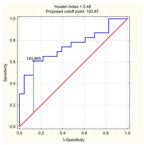 ROC curve for C18:1-carnitine as a predictor of significant liver fibrosis (ElastPQ > 5.56 kPa) in PBC. The optimal cutoff of 193.87 ng/mL was determined based on the highest Youden index (0.48), maximizing specificity (87.0%) while maintaining moderate sensitivity (60.9%). Blue line—ROC curve, red line—baseline, green line—optimal cutoff (Youden index).