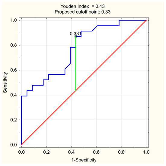 ROC curve for FFA (mM/L) as a predictor of significant liver fibrosis (ElastPQ > 5.56 kPa) in PBC. The optimal cutoff of 0.33 mM/L was determined based on the highest Youden index (0.43), balancing high sensitivity (87.0%) with moderate specificity (56.5%). Blue line—ROC curve, red line—baseline, green line—optimal cutoff (Youden index).