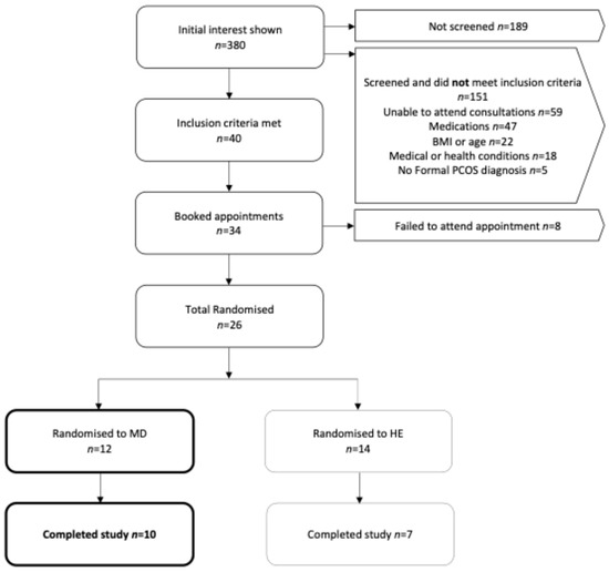 - Love, J.G.; McKenzie, J.S.; Nikokavoura, E.A.; Broom, J.; Rolland, C.; Johnston, K.L. The experiences of women with polycystic ovary syndrome on a very low-calorie diet. Int. J. Women’s Health 2016, 2016, 299–310. [Google Scholar]