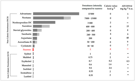 The evolving regulatory landscape surrounding ASs underscores the need for a clear understanding of their classification and properties. Based on their caloric content, these sweeteners are typically classified as Non-Caloric Sweeteners (NSCs) and Low-Caloric Sweeteners (LSCs). The characteristics of these sweeteners, including their relative sweetness compared to sucrose, caloric values, and ADIs, are summarized in Figure 1.