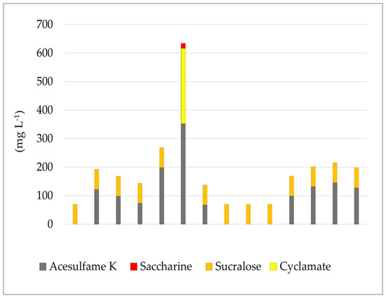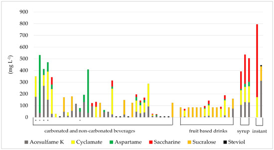 Although sucralose is commonly used as a sweetener, its content could not be measured in this study. To provide a more accurate representation of the presence and proportion of various ASs, we utilized average sucralose values reported in previous studies that analyzed similar food products. The average sucralose concentration used for the group of soft drinks was 124 mg L−1, while for fruit-based drinks, it was 80 mg L−1 [36,37,38,39,40,41] (Figure 2).