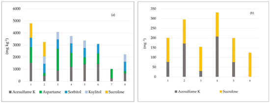 Distribution of different artificial sweeteners in samples analyzed in this study, including only samples in which artificial sweeteners were found: (a) chewing gums; (b) energy drinks.