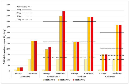 Presentation of different consumption scenarios based on average and highest artificial sweeteners values in the analyzed products, compared to the acceptable daily intake for subjects of different ages and body weights.