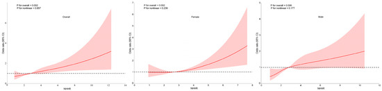To explore potential non-linear relationships between NHHR and CKD, RCS analysis was conducted, with the results presented in Figure 2. After adjusting for covariates, a consistent linear dose–response relationship was observed between NHHR and CKD in the overall population, as well as in both females and males (all p for nonlinearity > 0.05). This suggests that higher NHHR levels are associated with an increased likelihood of CKD. Additionally, a linear relationship between NHHR and CKD was observed in the dataset after PSM (Figure S1). Furthermore, a piecewise regression analysis was conducted to evaluate the threshold effect of NHHR on CKD. The log-likelihood ratio test yielded a p-value > 0.05, suggesting that the relationship between NHHR and CKD does not significantly deviate from a linear model (Table S4).
