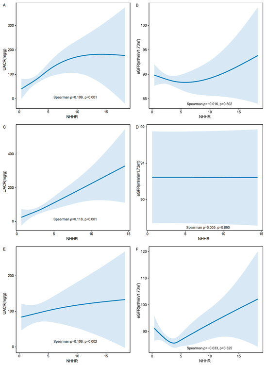 To further investigate these relationships, GAMs were used to evaluate the associations of NHHR with both UACR and eGFR in the overall population, as well as in females and males separately. As shown in Figure 3A,C,E, a statistically significant positive correlation was observed between NHHR and UACR (mg/g), with Spearman correlation coefficients of ρ = 0.109 (p < 0.001) in the overall population, ρ = 0.118 (p < 0.001) in females, and ρ = 0.106 (p = 0.002) in males. The smooth-fitted curves demonstrated a modest upward trend, suggesting that higher NHHR levels may be associated with increased UACR values. In contrast, no statistically significant correlation was found between NHHR and eGFR (mL/min/1.73 m2) in the overall population (ρ = −0.016, p = 0.502; Figure 3B), females (ρ = 0.005, p = 0.850; Figure 3D), or males (ρ = −0.033, p = 0.325; Figure 3F), indicating no significant relationship between NHHR and eGFR.