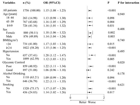 Hypertension was characterized by systolic blood pressure readings of 140 mmHg or higher, diastolic blood pressure of 90 mmHg or above, combined with a self-reported diagnosis of hypertension documented by medical institutions [29]. The body mass index (BMI) was calculated as weight (kg) divided by height squared (m2) and was categorized as <24 kg/m2 and ≥24 kg/m2 for the subgroup analysis [30]. Elevated glycemic markers were defined as HbA1c levels of 7.0% or more or FPG concentrations of 7.0 mmol/L or higher [31]. Educational background was categorized into three groups: secondary education or less, senior high school completion, and attainment of college education or higher. Marital status was divided into two classifications: married and other (including single, divorced, or widowed). Participants were stratified by age into young adults (18–44 years), middle-aged adults (45–59 years), and older adults (60 years and above). Residential status was classified as urban or rural based on the geographic location of participants’ homes. Routine exercise was defined as engaging in exercise for a minimum of 30 min per day, at least five days per week [32]. Smoking status was determined by current daily or occasional cigarette use, while alcohol drinking was recorded if participants had consumed alcoholic beverages within the past 30 days [33].