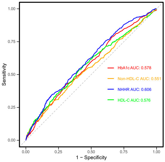 The ability of NHHR to diagnose CKD in T2DM individuals was evaluated using ROC curve analysis, as depicted in Figure 5. The analysis produced an AUC (95% CI) of 0.606 (0.577–0.635), indicating moderate diagnostic precision. The optimal threshold for NHHR was determined to be 3.48, with sensitivity and specificity values of 60.2% and 55.2%, respectively. Additionally, NHHR was compared with its individual elements (non-HDL-C and HDL-C) and HbA1c. The AUC (95% CI) values for non-HDL-C, HDL-C, and HbA1c were 0.551 (0.521–0.582), 0.576 (0.545–0.606), and 0.578 (0.548–0.607), respectively. According to the DeLong test, NHHR demonstrated significantly better predictive performance than HbA1c, non-HDL-C, and HDL-C (all p < 0.05), while no notable differences were observed among the other markers (all p > 0.05). These findings indicate that the composite NHHR offers greater diagnostic value.
