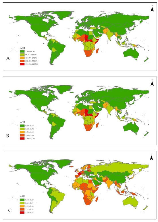 Global age standardized rate of global suboptimal breastfeeding (A) DALYs, (B) mortalities, and (C) YLDs.