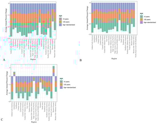 Under 5 years regional 1990 to 2021 suboptimal breastfeeding AAPCs of (A) DALYs, (B) mortalities, and (C) YLDs.