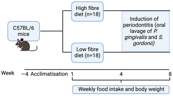 Diets were sourced from Speciality Feeds (Glen Forrest, WA, Australia) and were stored in a refrigerator at 4 °C to protect them from light and moisture. Two different diets containing resistant starch were prepared by incorporating Gem Star resistant starch (RS) and Guar Gum in varying ratios: a high-fibre diet consisting of 20% RS and 20% Guar Gum and a low-fibre diet containing 1.15% RS and 1.15% Guar Gum. The digestible energy contents of the high-fibre and low-fibre diets were 10.7 MJ/kg and 16.8 MJ/kg, respectively. These experimental diets were provided from week 1 to week 8 (Figure 1). Detailed compositions of the two diets are provided in the Supplementary Table S1. To ensure consistency in intake, diets were weighed twice a week. In cages where intake was lower, food was cut into 1 cm rounds to facilitate holding and consumption by the mice.