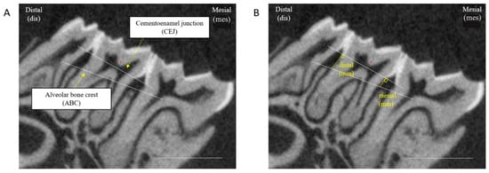 The distance between the CEJ and ABC as a measurement of alveolar bone loss (mm). (A): Images were reoriented such that the CEJ and ABC at the middle of the M2 molar appear at the same slice. (B): The distance between the CEF and ABC was measured at two sites of the M2 molar tooth.