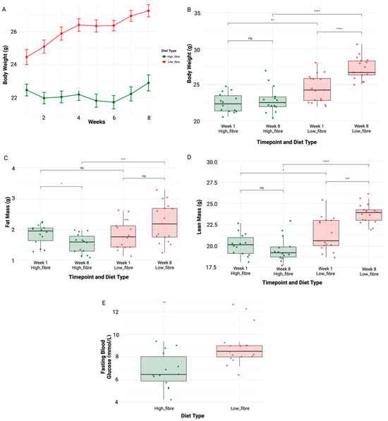 (A) Weekly body weight change for mice on high-fibre and low-fibre diets from baseline (week 1) to endpoint (week 8); (B) comparison of body weight from baseline (week 1) to endpoint (week 8) between high-fibre and low-fibre diets; (C) comparison of fat mass from baseline (week 1) to endpoint (week 8) between high-fibre and low-fibre diets; (D) comparison of lean mass from baseline (week 1) to endpoint (week 8) between high-fibre and low-fibre diets; (E) fasting blood glucose levels at endpoint (week 8) for mice fed low- and high-fibre diets. Statistical significance: ns = not significant; * p < 0.05; ** p < 0.01; *** p < 0.001; **** p < 0.0001.