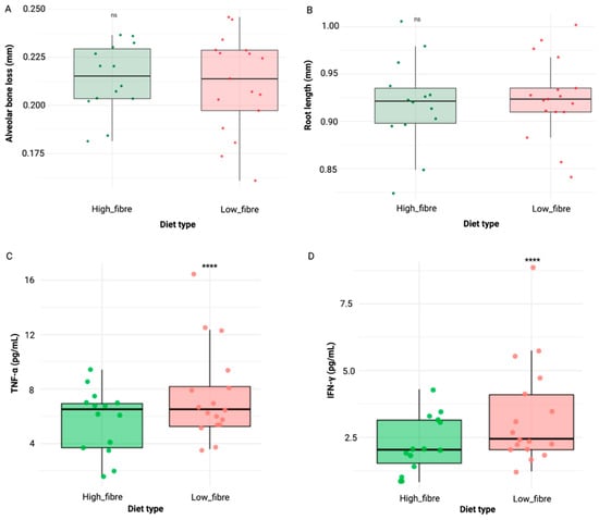 Comparison of alveolar bone loss (A), root length (B), TNF-α (C), and IFN-γ (D) at week 8 between mice fed low- and high-fibre diets. Statistical significance is indicated as follows: ns = not significant; **** p < 0.0001.
