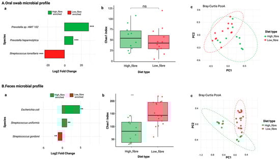 Microbial profiles identified in (A) oral swab samples (high fibre: n = 11, low fibre: n = 12) and (B) faeces samples (high fibre: n = 14, low fibre: n = 17). (a) Differentially abundant microbial species between high-fibre (green) and low-fibre (red) diet groups, identified using DESeq2. Log2-fold changes indicate enrichment in either diet group, with statistical significance denoted by asterisks. (b) Alpha diversity analysis based on the Chao1 index, comparing species richness between high-fibre and low-fibre diet groups. (c) Beta diversity analysis using Principal Coordinates Analysis (PCoA) based on Bray–Curtis dissimilarities, illustrating significant differences in microbial community compositions between diet groups. Each point represents an individual sample, with ellipses indicating group clustering. Statistical significance: ns = not significant; ** p < 0.01; *** p < 0.001.