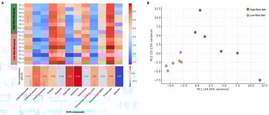 (A) Short-chain fatty acid (SCFA) profiles in high-fibre and low-fibre diet groups. Individual sample values were plotted in a heatmap, with samples grouped by dietary conditions. To directly compare high-fibre and low-fibre diets, the mean SCFA levels for each group were calculated, and the difference was computed and represented at the bottom (SCFA values were log10-transformed to normalise differences in magnitude across compounds). (B) Visualisation of variation in faecal metabolite profiles between high-fibre and low-fibre diet groups using Principal Component Analysis (PCA). All concentrations were log-transformed (log10) and standardised using z-score normalisation.