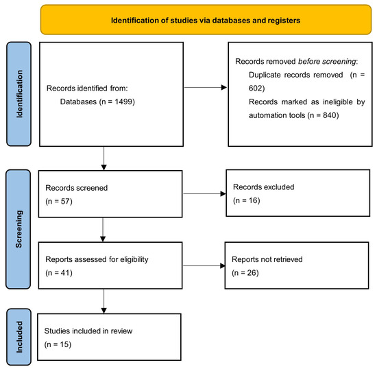 The search initially found 1499 records that were collected and imported into EndNote 21 (Clarivate Analytics). After having removed duplicates, the number decreased to 897. Given the adopted criteria, 840 papers were excluded. After a detailed review of the topics and abstracts, 41 papers were considered to be of potential interest. The above papers were subjected to full-text evaluation, which resulted in the inclusion of 15 papers in this study. The search strategy is shown in Figure 1. The characteristics of the included studies are summarised in Table 1, Table 2, Table 3 and Table 4. Four of them were descriptive research, three were cross-sectional, three were pilot studies, two were qualitative research, one was longitudinal, one was implementation research, and one was evaluative research. None of the authors declared any conflicts of interest.