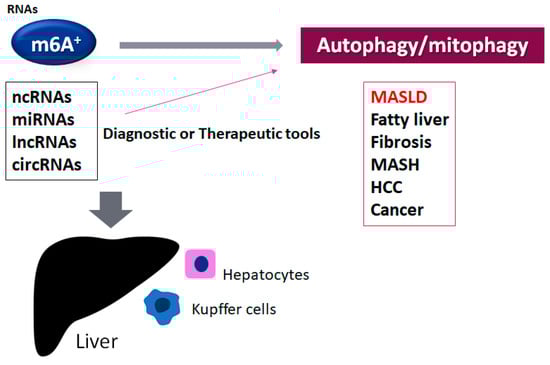 An illustration of the connection of the m6A-methylated RNAs to various liver disorders. The roles of the alteration of autophagy/mitophagy by the m6A-methylated ncRNAs such as miRNA, lncRNA, and circRNA have been suggested for liver dysfunction such as MASLD, fatty liver disease, liver fibrosis, metabolic dysfunction-associated steatohepatitis (MASH), hepatocellular carcinoma (HCC), and other cancers. The m6A-modified ncRNAs can be diagnostic and/or therapeutic tools for these disorders. The plus sign shows the existence of the modification of m6A in RNAs.