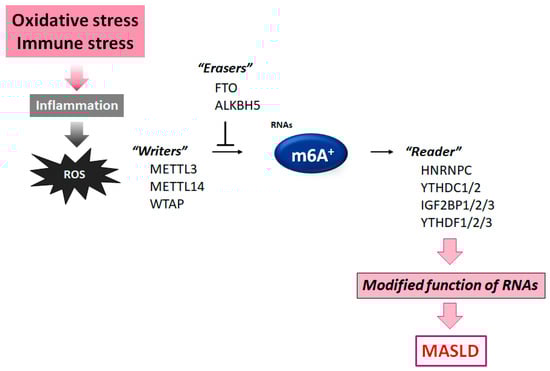 The m6A-RNAs can play a crucial role in the inflammatory response induced by various oxidative stresses. It has been described that certain immunological stress triggered by lipopolysaccharide (LPS) stimulation could influence the level of m6A-RNAs [31]. Consequently, the downregulation of METTL3 could invert the LPS-provoked cell damage by increasing mRNA stability [32]. Also, the deletion of METTL3 might increase the expression of another gene, which could inhibit the NF-κB signaling in cells treated with LPSs [33]. Moreover, the altered expression of “reader” molecules may be associated with the development of various inflammation processes [34], which may also play imperative roles in several pathological progressions, including inflammatory and/or autoimmune responses [27,35]. Silencing the function of FTO could also prevent IL-1β expression via the NF-κB signaling pathway [29,36]. In addition, a decrease in YTHDF2 might initiate several inflammation reactions in hepatocellular carcinoma (HCC) [37]. Remarkably, the METTL3 expression may be upregulated through the increased production of ROS during inflammation [38]. Therefore, the ROS content may be increased with the related elevation of m6A levels in liver inflammation [25]. Interestingly, the methylation of m6A in several RNAs may be altered under oxidative stress [25]. The ROS level may increase the expression of YTHDF2 for the rise in m6A [25]. Hence, the modification of m6A may be a widespread event under the situation of oxidative stress. In addition, several immunological stress could also influence the m6A level of mRNAs [31,39]. In particular, the change in ROS levels with immunological stress might simultaneously contribute to the elevation of the m6A-RNA level [40]. Recently, it has been reported that METTL3 can promote the progression of MASLD by mediating the m6A methylation of fatty acid synthase mRNA [41]. Again, the m6A methylation may be closely associated with the increased level of ROS production, which might be related to the development of MASLD (Figure 2).