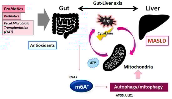By augmenting autophagy, the cellular regeneration of hepatocytes could be prominently restored [64]. The hepatocyte regeneration from acute liver injury may be beneficial, which has been characterized by a well-arranged regenerative process in the liver [65]. On the other hand, abnormal autophagy may result in the development of a variety of liver diseases, including MASLD with impaired liver regeneration [66]. In particular, atypical autophagic function and activated inflammation may be typical features in a damaged liver [66]. In fact, autophagy could be repressed by noticeable decreases in the expression of ULK1 and the LC3II/LC3I ratio in human MASLD patients [66]. Defective autophagy might be related to the expansion of resident Gram-negative bacteria in the intestine [67], which can suggest the relationship between the gut and liver via the alteration of autophagy [68]. The liver and intestinal tract are closely and functionally related [69]. In healthy conditions, the gut microbiota maintains ordinary function for the host by delivering necessary nutrients from dietary foods. The composition of gut the microbiota is flexible and dynamic, which may be related to diet, age, stress, and/or drugs. When the gut microbiota is under dysregulation, it could result in the initiation and progression of various liver diseases including MASLD, modulating immune responses. In MASLD patients, it has been observed that gut bacteria could transfer across the portal vein into the liver and trigger unusual activation of the immune system, leading to inflammation responses and liver injury [70]. Communication between the intestine and liver may be bidirectional. For example, hepatogenic inflammatory cytokines could damage the gut mucosal barrier function, which could also form a liver–gut vicious cycle during the pathology of MASLD [71]. Interestingly, it has been described that the m6A modification not only regulates intestinal mucosal immunity and intestinal barrier function but could also influence apoptosis and/or autophagy in gut cells [72]. Understanding the detailed interaction between m6A methylation and autophagy would be a striking topic in cellular biology. Therefore, further in-depth investigations are necessary to elucidate the mechanism for the modification of autophagy under pathological conditions.