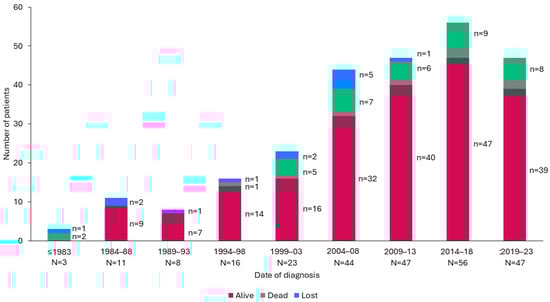 Of the 255 patients included, 103 were diagnosed between 2014 and 2023. The global incidence in the last 10 years was 1:36,063 births (95% CI, 29,719–44,164), and the prevalence at the end of 2023 was 1:238,200. The incidence for each disease is shown in Table 2. On average, there were 10.3 new cases annually and 1.7 deaths per year (Figure 1).