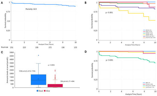 Mortality rates varied based on sex, diagnosis, onset type, and ammonia levels at presentation (Figure 2). Overall mortality for the cohort was 14.9% over a median follow-up of 10.6 years (IQR 4.1–17.8 years). The diagnosis of deceased patients included 21 with OTCD (55.3%), of whom 17 were males, 7 with CPS1D (18.4%), 6 with ASS1D (15.8%), 3 with ASLD (7.9%) and 1 with NAGSD (2.6%). None of the patients with another diagnosis died. The median age at death was 25.5 days (IQR 7.3 days–13 years), most deaths occurring within the first months of life. Among the 38 deceased patients, 65.8% were male and 34.2% female (p = 0.03). Mortality was higher in CPS1D cases (36.8%) and among male OTCD patients (32.1%) compared to other diagnoses (p = 0.013). Moreover, EO cases presented a higher mortality rate (35.8%) compared to those with LO (7.1%) (p < 0.0001). The median ammonia level in deceased patients was higher, 1058 µmol/L (IQR 410–1793 µmol/L), than in surviving patients, 294 µmol/L (IQR 71–494 µmol/L) (p < 0.0001). Excluding neonatal deaths, mortality was higher but not significantly in patients under medical management (MM) (6.3%) than in those who underwent LT (4.8%).