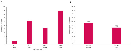 Age distribution of patients at follow-up. (A) Number of patients by age group. (B) Percentage of patients categorized as children. 109 females (53.4%) and 95 males (46.6%).