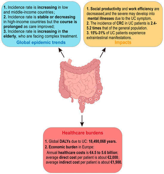 In addition, as reported by the Global Burden of Disease Study, the annual healthcare burden due to UC in Europe is about EUR 4.5 to 5.6 billion, and the global disability-adjusted life years (DALYs) of UC is 18,490,068 years [15,16]. It has an average of about EUR 2000 of direct healthcare costs per UC patient (including hospitalization, surgical expenditures, and drug-related expenditures), and about EUR 1900 of indirect healthcare costs (including reduced income due to, e.g., reduced work efficiency due to illness) [10]. In summary, the global epidemic trend of UC is generally rising, with far-reaching impacts and significant healthcare burdens (Figure 1).