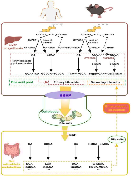 The liver is the exclusive organ that synthesizes BAs, and cytochrome P450 (CYP450) in its parenchymal cells mediates cholesterol oxidation to produce primary BAs. There are two main pathways for its synthesis: the cholesterol 7α-hydroxylase (CYP7A1)-mediated “classical pathway” and the sterol-27-hydroxylase (CYP27A1)-mediated “alternative pathway”. In the classical pathway, the rate-limiting enzyme is CYP7A1, determining the yield of BAs. Most cholesterol is initially hydroxylated by CYP7A1, and subsequently converted to CA through the action of microsomal sterol 12α-hydroxylase (CYP8B1) and mitochondrial CYP27A1. The intermediates are instead converted into CDCA when CYP8B1 is lacking. In the alternative pathway, cholesterol is first transformed into 2,7α-hydroxycholesterol by CYP27A1, and then further hydroxylated into CDCA by the enzyme sterol 7α-hydroxylase (CYP7B1), which is a rate-limiting enzyme in this pathway. The ratio between the two primary BAs—CA and CDCA—is determined by CYP8B1, which is not regulated by microbial influences [23]. In healthy individuals, at least 75% of primary BAs are produced via the classical pathway; in rodents, particularly in mice, the alternative pathway can contribute to as much as 50% of BAs’ production [24]. In addition to CA and CDCA, certain lines of research propose that UDCA may also function as a primary BA in mice—as it can serve as a biosynthetic precursor to β-MCA—even though it makes up only about 1% of the total BA pool [21,23]. Most of the CDCA and UDCA are metabolized to α-MCA and β-MCA in mice, respectively, by sterol-6β-hydroxylase (CYP2C70) [22].
