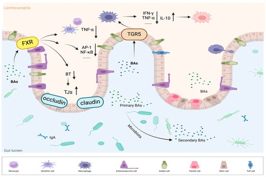 BAs—through FXR and TGR5 signaling—help maintain epithelial barrier integrity, modulate cytokine production, and orchestrate immune cell activity, thereby shaping the overall inflammatory and immune responses (Figure 3).