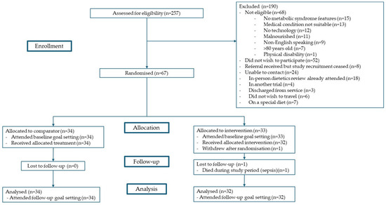 The U-DECIDE study was a single-centre, 26-week, parallel RCT with a 1:1 allocation. The study was conducted between December 2020 and June 2022. Target participants were adults with kidney (CKD, haemodialysis, peritoneal dialysis, or transplant) or liver (chronic liver disease or transplant) disease who were at increased cardiometabolic risk (having ≥ 1 feature of MetS per the harmonised criteria [6]) and receiving specialist care at the Princess Alexandra Hospital in Brisbane, Australia. All participants received usual medical care and, additionally, were offered an initial dietitian consultation and a wearable activity monitor. The intervention group was offered access to a suite of digital health technologies, including text messages, a nutrition app, an exercise app, and video consultations with a dietitian and/or video consultations with an exercise physiologist. The comparator group was offered an individualised review with a dietitian (per standard care) with follow-up frequency as deemed clinically appropriate. These participants did not have access to the digital health technologies or exercise physiologists via the study. Further details on study design, eligibility criteria, recruitment, randomisation methods, and procedures of the U-DECIDE study have been outlined in detail in the protocol publication [16], and participant flow has been summarised in Figure 1. Of note, this study was conducted during the COVID-19 pandemic, which did have an impact on the rate and number of participants recruited. This study is reported in line with the CONSORT extension to pilot and feasibility trials [18] and Template for Intervention Description and Replication (TIDieR) [19] guidelines.