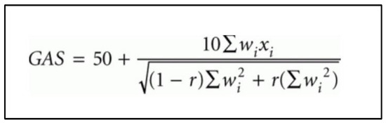 Goal attainment scale (GAS) formula as proposed by Kiresuk and Sherman [4]. wi = weight score assigned to the goal. Weight scores are added together if more than 1 goal. xi = performance score achieved (i.e., between −2 and +2). r = expected correlation of the goal scales, approximating to 0.3 [4].