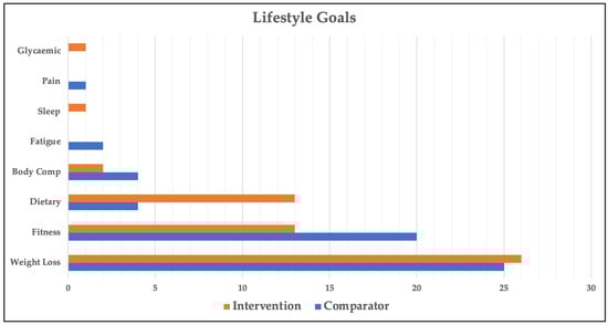 Goal setting was completed by all 67 participants; however, 1 participant died prior to the 26-week post-study goal review session and was excluded from all goal setting and goal attainment analyses. Of the 66 participants analysed, 46 chose 2 goals and 20 chose 1 goal (112 goals in total). The categories and distribution of participant-generated goals are shown in Figure 3. The most common goal across all participants was related to weight loss (46% of goals). The next two most common goals were related to fitness (29%) and diet (15%). There was a statistically significant difference in goal categories between the intervention and comparator groups (p = 0.04, Cohen’s W = 0.34, power = 74.8%), most notably in dietary (7% vs. 23%) and fitness (34% vs. 27%) goals. Table 2 provides more granular detail on participants’ dietary and fitness goals.