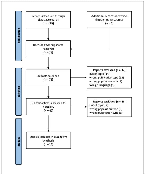 The database search yielded a total of 119 studies (PubMed: 24, WOS: 50, Embase: 45). After removing 40 duplicates, 79 records remained for screening. Following title and abstract screening, 60 studies were excluded, leaving 19 full-text articles that met the inclusion criteria and were included in the qualitative synthesis (Table 1).