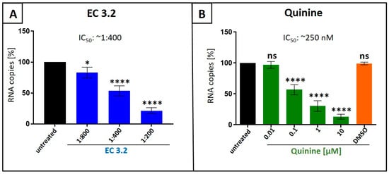 Treatment with increasing amounts of EC 3.2 (1:3200–1:800) in combination with 1 µM of quinine (IC50 value for inhibition of SARS-CoV-2 replication) results in a complete blockage of the replication capacity, independent from the dilution of EC 3.2. Treatment with the identical dilution series of EC 3.2 in the presence of 100 nM quinine also resulted in significant antiviral efficacy. Viral replication was reduced by 80–97%, from the lowest to highest concentrations of EC 3.2 (Figure 6A,B).