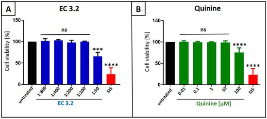 Influence of EC 3.2 (A) or quinine (B) on the cell viability of MDCKII cells. Following treatment with different dilutions of EC 3.2 or concentrations of quinine sulfate (indicated at the x-axis) for two days, the influence on cell viability was measured via water-soluble tetrazolium salt (WST)-1 assay. Bars represent means of three independent experiments ± SD. Staurosporine (StS, 1 µM) was used as a positive control. Statistical analysis was performed using a multiple comparison Kruskal–Wallis test (Anova) followed by Dunn’s post hoc test (*** p < 0.06; **** p < 0.0001; and ns = not significant versus the untreated control).