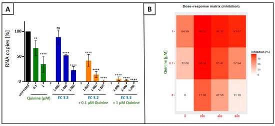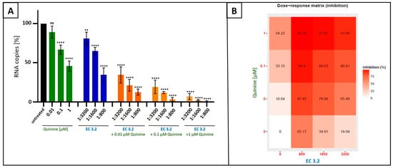 In contrast, individual treatment with EC 3.2 or quinine alone had only minor effects on viral replication at concentrations tested (Figure 3A). Single treatment with the lowest tested dilution of EC 3.2 (1:800) showed no significant influence on viral replication (Figure 3A). In contrast, the highest concentration of quinine (1 µM) reduced viral replication by max. 64% (Figure 3B). However, the combination treatment (1:800 EC 3.2 and 1 µM quinine) almost completely inhibited viral replication, which points towards a synergistic antiviral effect.