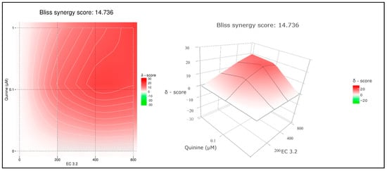 To quantify the effects of combination treatment, synergy scoring was conducted using the Bliss independence model. The conducted small molecule interaction analysis resulted in a Bliss synergy score of 14.7 for the combination of EC 3.2 and quinine for inhibiting replication of IAVPR-8 (Figure 4).