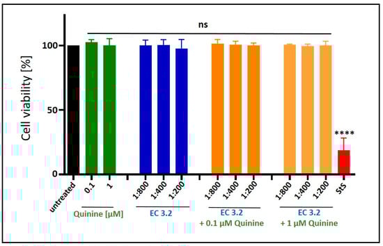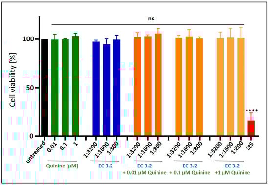 Influence of the combinatory treatment of quinine with EC 3.2 on the cell viability of MDCKII cells. Following treatment with different dilutions of EC 3.2 or concentrations of quinine sulfate (indicated at the x-axis) for two days, the influence on cell viability was measured via water-soluble tetrazolium salt (WST)-1 assay. Bars represent means of three independent experiments ± SD. Staurosporine (StS, 1 µM) was used as a positive control. Statistical analysis was performed using a multiple comparison Kruskal–Wallis test (Anova) followed by Dunn’s post hoc test (**** p < 0.0001 and ns = not significant versus the untreated control).