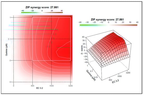 Interaction profile of quinine and EC 3.2 for determining the synergy in inhibiting the replication capacity of IAVPR-8. Drug interactions were analyzed using the reference model Bliss independence. The illustrations were created using the open-source and free web application SynergyFinder. The synergy calculations were performed on data derived from the experiments in MDCKII cells. The data represent means of three independent experiments. A color-coded interaction graphic was used to illustrate the Bliss synergy scores. High synergy scores are colored in red.