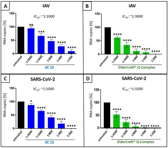 Antiviral activity of ElderCraft® Q-Complex against IAV and SARS-CoV-2 compared to EC 15. (A,B) MDCKII cells were infected with the IAV isolate A/Puerto Rico/8/34 (PR8) at an MOI of 0.01. Thirty minutes after infection and removal of input virus, cells were treated with indicated dilution steps of EC 15 (A) or ElderCraft® Q-Complex (B). Cell culture supernatants were harvested at 2 days post infection (dpi). The virions were purified and analyzed via qRT-PCR. Bars show mean values of three independent experiments ± standard deviation. Statistical analysis was performed using a multiple comparison Kruskal–Wallis test (Anova) followed by Dunn’s post hoc test (*** p < 0.0002; **** p < 0.0001; and ns = not significant versus the untreated control). (C,D) Calu-3 cells were infected with the clinical isolate SARS-CoV-2PR-1 at an MOI of 2 × 10−2. One hour after infection and removal of input virus, cells were treated with indicated concentrations of EC 15 (C) or ElderCraft® Q-Complex (D). Cell culture supernatants were harvested at 3 dpi. The virions were purified and analyzed via qRT-PCR. Bars show mean values of four independent experiments ± standard deviation. Statistical analysis was performed using a multiple comparison Kruskal–Wallis test (Anova) followed by Dunn’s post hoc test (* p < 0.0192 and **** p < 0.0001 versus the untreated control).