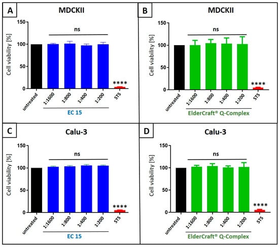 Influence of EC 15 (A,C) or ElderCraft® Q-Complex (B,D) on the cell viability of MDCKII (A,B) and Calu-3 (C,D) cells. Following treatment with different dilutions of EC 15 (A,C) or ElderCraft® Q-Complex (B,D) (indicated at the x-axis) for two (A,B) or three (C,D) days, the influence on cell viability was measured via water-soluble tetrazolium salt (WST)-1 assay. Bars represent means of three independent experiments ± SD. Staurosporine (StS, 1 µM) was used as a positive control. Statistical analysis was performed using a multiple comparison Kruskal–Wallis test (Anova) followed by Dunn’s post hoc test (**** p < 0.0001 and ns = not significant versus the untreated control).