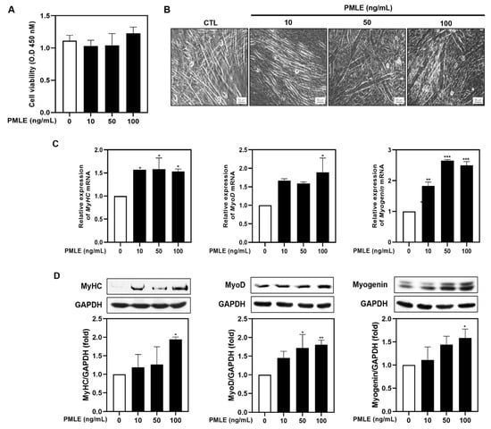 Mouse-derived C2C12 myoblasts (American Type Culture Collection; Manassas, VA, USA; ATCC-CRL 1772) were cultured in a growth medium (GM; DMEM containing 10% heat-inactivated FBS and antibiotics) at 37 °C under 5% CO2. For differentiation, cells were seeded in 6-well plates at a density of 5 × 104 cells/well. Once 80–90% confluent, cells were transitioned from a growth medium to a differentiation medium (DM; DMEM with 2% HS) and incubated for 5–7 days (Control, CTL). PMLE was supplemented in the medium throughout the differentiation period with media refreshed every 2 days. Morphological assessment of myotubes was conducted via a phase-contrast microscope (Nikon TS2; Nikon, Tokyo, Japan). Photographs were captured at ×50.