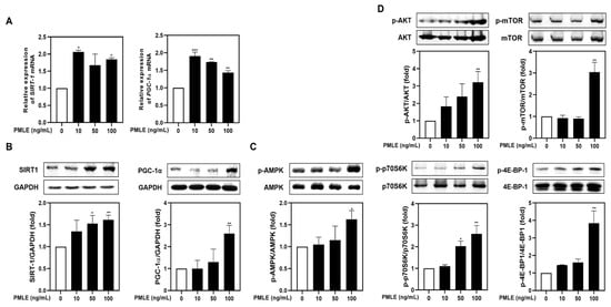 To determine whether PMLE modulates mitochondrial function during myogenic differentiation, we analyzed the mRNA and protein levels of PGC-1α and SIRT1. PMLE treatment resulted in a marked elevation of both markers, confirming the activation of mitochondrial biogenesis pathways (Figure 2A,B). In addition, PMLE enhanced AMPK phosphorylation, a key event in mitochondrial signaling (Figure 2C). Simultaneously, phosphorylation of proteins in the Akt/mTOR cascade—Akt, mTOR, p70S6K, and 4E-BP1—increased in a concentration-dependent manner (Figure 2D), suggesting improved protein synthesis capability. These data collectively support that PMLE facilitates muscle cell differentiation by concurrently activating mitochondrial biogenesis and protein synthesis pathways.